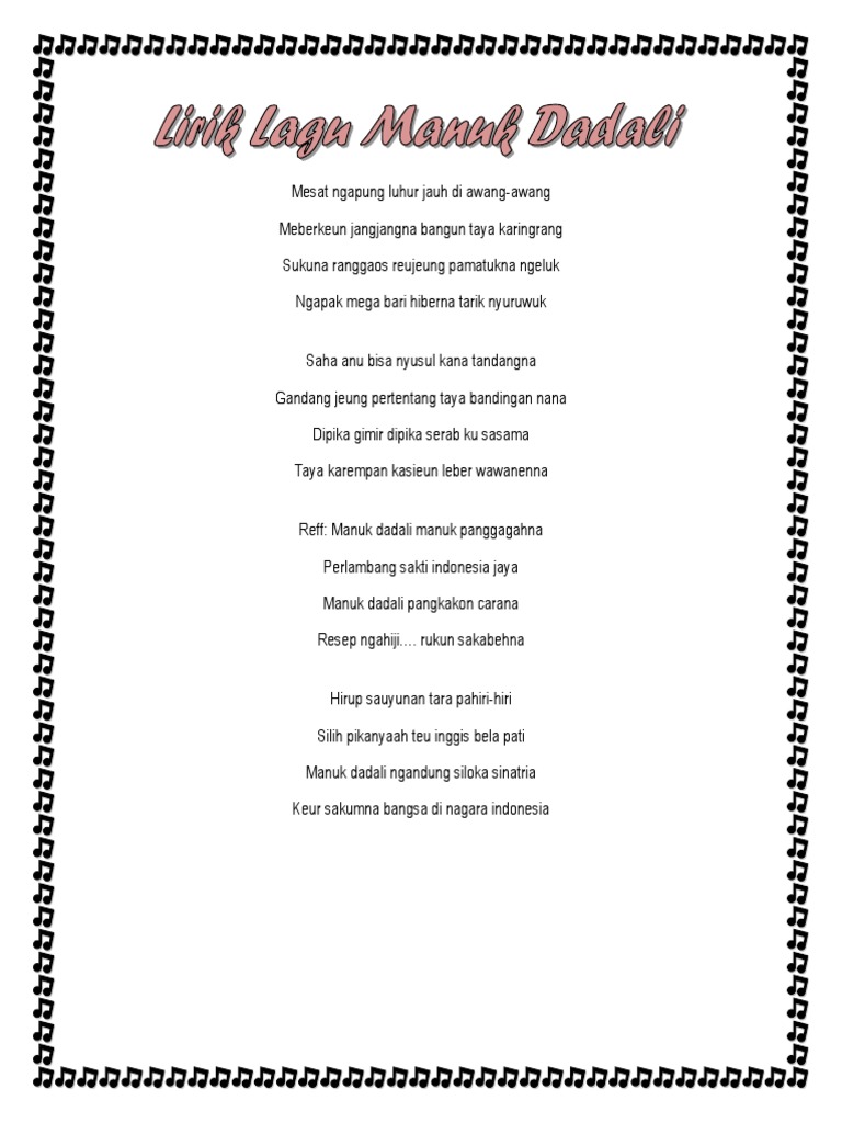 Lirik lagu manuk dadali. Lagu daerah sunda jawa barat yang cukup populer. Manuk dadali manuk panggagahna perlambang sakti indonesia jaya manuk dadali pangkakon carana resep ngahiji rukun sakabehna hirup sauyunan tara pahiri hiri silih pikanyaah teu inggis bela pati manuk dadali ngandung siloka sinatria keur sakumna bangsa di nagara indonesia cipt. Manuk dadali adalah lagu berbahasa sunda ciptaan sambas mangundikarta.